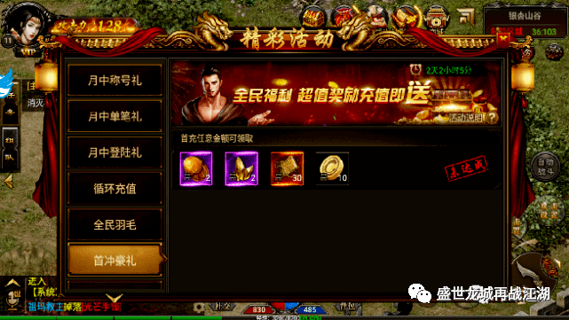 首冲礼包:64级+6武器一把+2转本职业衣服一件+1个高级转生丹(5万转生修为)+1000绑元