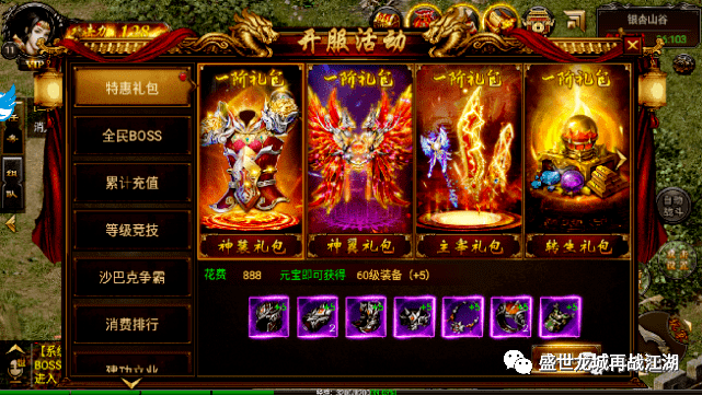 然后去开服活动的特惠礼包买个神装礼包8.8元,送全身+5装备,不卡任务 如图