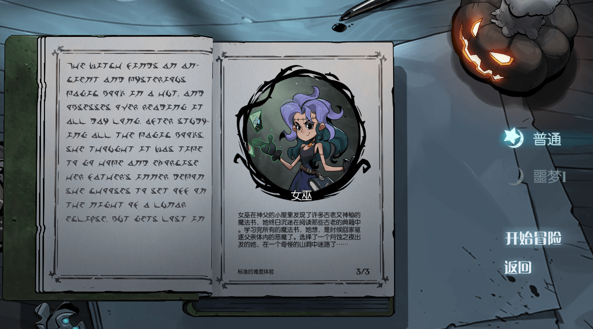 女巫在游戏内的背景故事充满着孤独感,她在神父的小屋内发现了很多古老又神秘的魔法书,因为终日沉迷在阅读中所以她学习完备了所有的书籍,在选择回家清除父亲体内的恶魔时,她却因为路痴迷了路……虽然这个故事显得有些戏剧性,但是女巫的冒险就这样开启了。