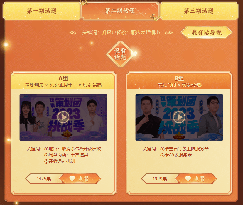 第三期的话题则是【明年玩什么?】,两组成员的提案内容也已经正式公布。2024年新玩法是否会在今年的嘉年华发布会上公布呢?让我们拭目以待!