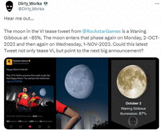 推主@Dirty_Worka分析称,图中的月相为亮度约85%的凸月,月亮将在10月2日和11月1日再次进入相同状态,这或许意味着R星会在这两天公布更多情报。