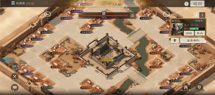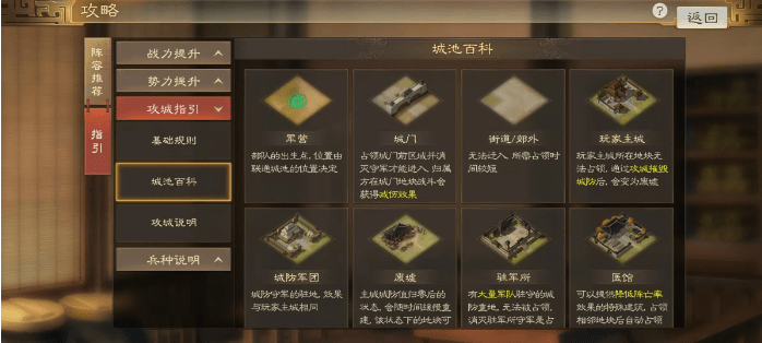 攻城战斗中以击破城防府为最终目标,玩家不需要在以此进攻中击破,可以多次重复尝试。在消灭城内的守军时要注意回合内的时间限制,若超出时间限制则会进入自动战斗的状态。在工程过程中可以利用好投石车来破坏城池内的工事和建筑,达到更好的效果。城池内的医馆可以提供降低阵亡率效果,乐坊可以提高我军的战斗士气,占领相邻的地块后即可自动占领。
