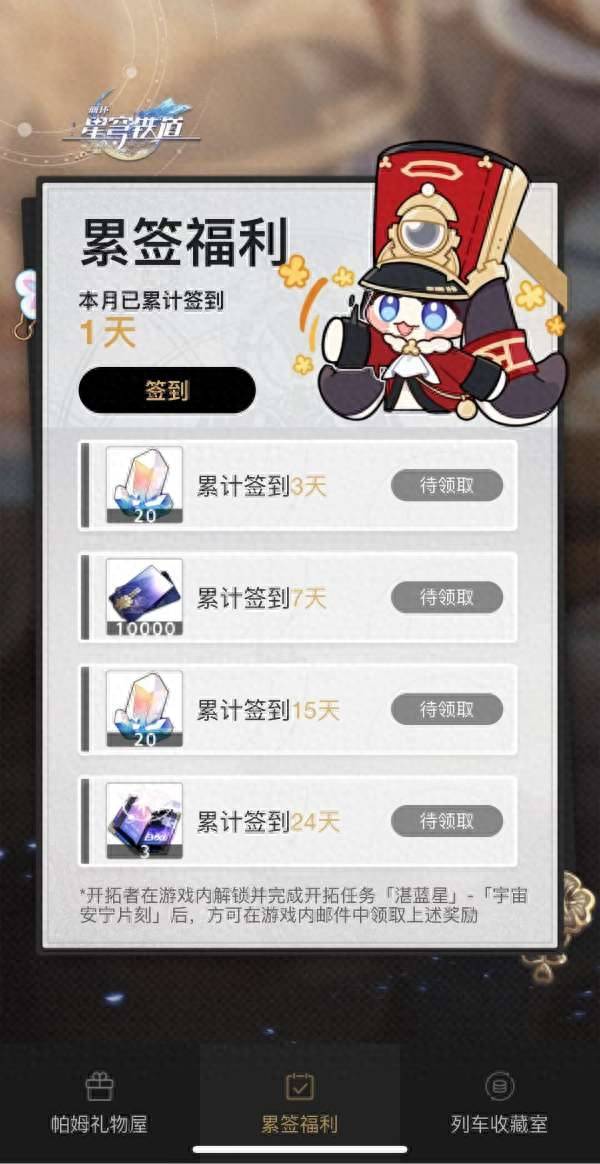 进入之后点击下方的累签福利进行签到每个月就可以获得总共40星琼哦!但是10月11日版本才开始,所以10月的3天签到的那20星琼已经被拿过了,其算到1.3版本。而11月15天赶上1.5版本开服,星琼算在新版本!