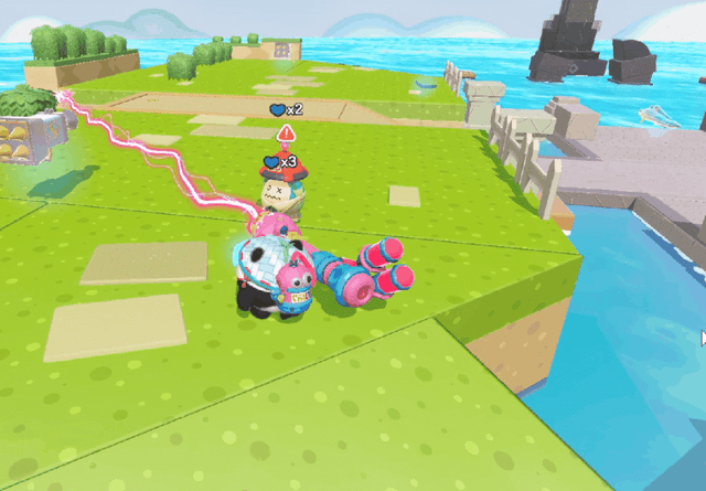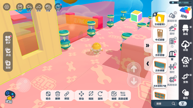与《动物派对》、《蛋仔派对》、《糖豆人》一样,《元梦之星》的组件贴图同样选取了Q萌可爱的积木卡通风格,说明元梦制作组对派对游戏的画风氛围是有一定研究的。然而这种Q萌的风格却并未得到充分发挥,就比如图中的弹力沙包,质感还是比较“塑料”的。同时,物品的贴图清晰度欠佳,这两点导致的视觉割裂感还是挺大的。