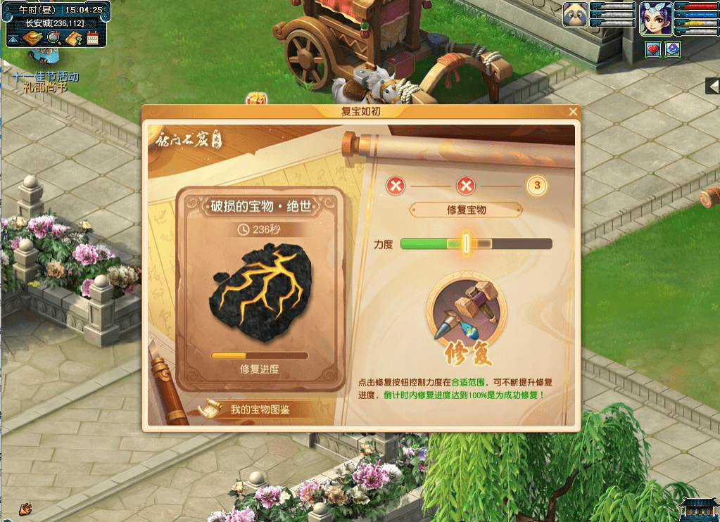 只需要等级≥50级的少侠就可以体验该玩法(单人玩法),活动期间,少侠每日可以前往长安城(237,113)处找到老匠人,参与“复宝如初”玩法,老匠人将从理论知识、审美考察、修复操作三个方面考核少侠的能力!