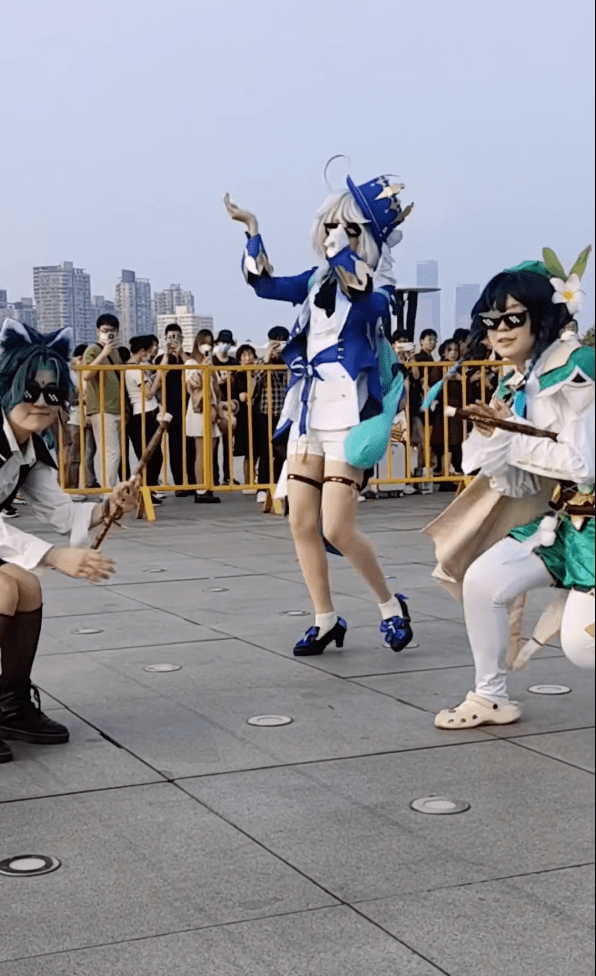 还有很多整活的玩家,穿着游戏角色的COS服来到现场,在音乐会开场之前,先在广场表演起来了,一时间好像大家不是来听音乐会的,而是来参加漫展的,只能说《原神》玩家搞气氛确实有一手。