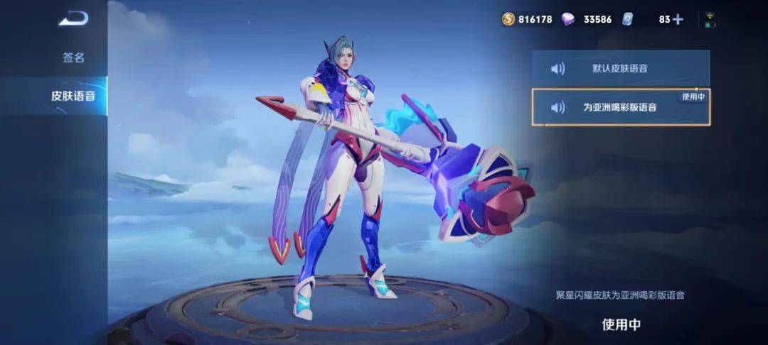 比如,这款皮肤还有两套语音,除了钟无艳原皮肤默认的语音之外,还有一套“为亚洲喝彩版”的语音。这或许才是这款皮肤原来的皮肤语音。只不过皮肤降级之后,改成了现在可以切换的方式。而且这套语音在你拿到皮肤的时候是附赠的,是直接可以在皮肤界面进行设置切换的。
