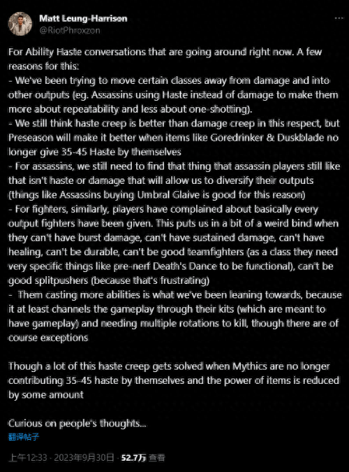 《英雄联盟》首席设计师Phroxzon在一条冗长的推文中详细介绍了他们的设计理念,“我们一直在尝试将某些类别从伤害转移到其他输出(例如,刺客要多出技能急速而不是伤害,使他们更注重拉扯和可重复性,而不是一击制)。” 首席设计师说道,这是他希望刺客的发展方向。