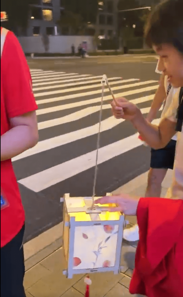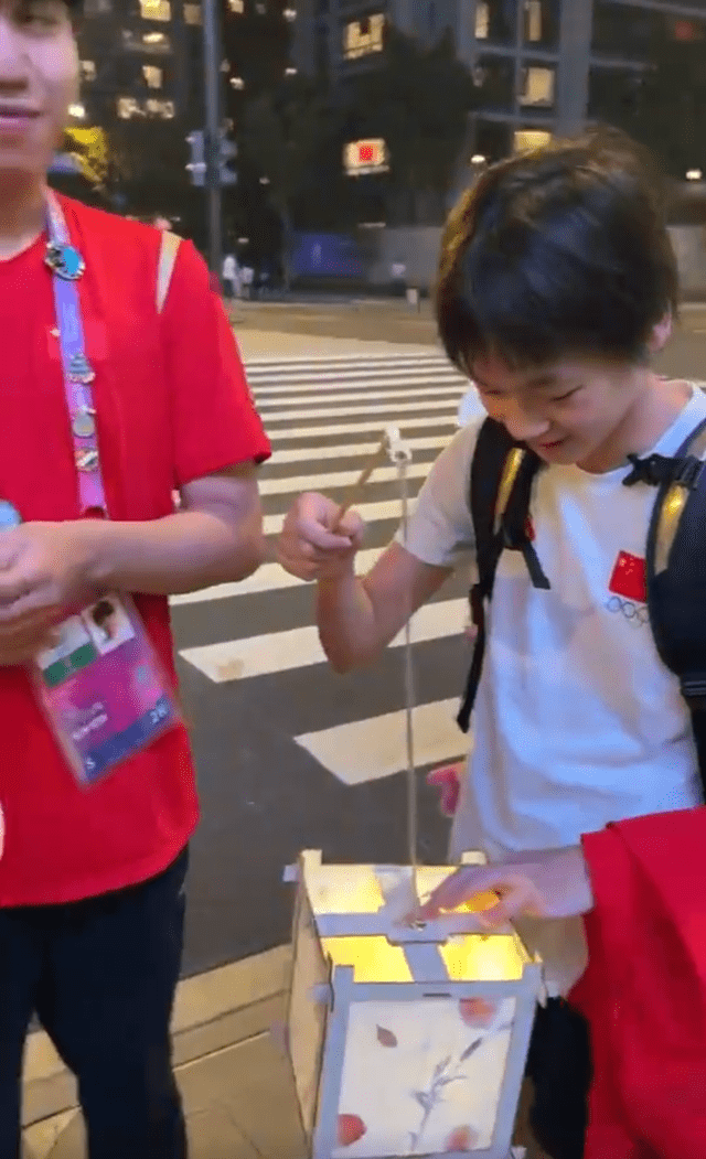 全红婵拿着灯笼高兴极了,不停地低头欣赏、把玩。