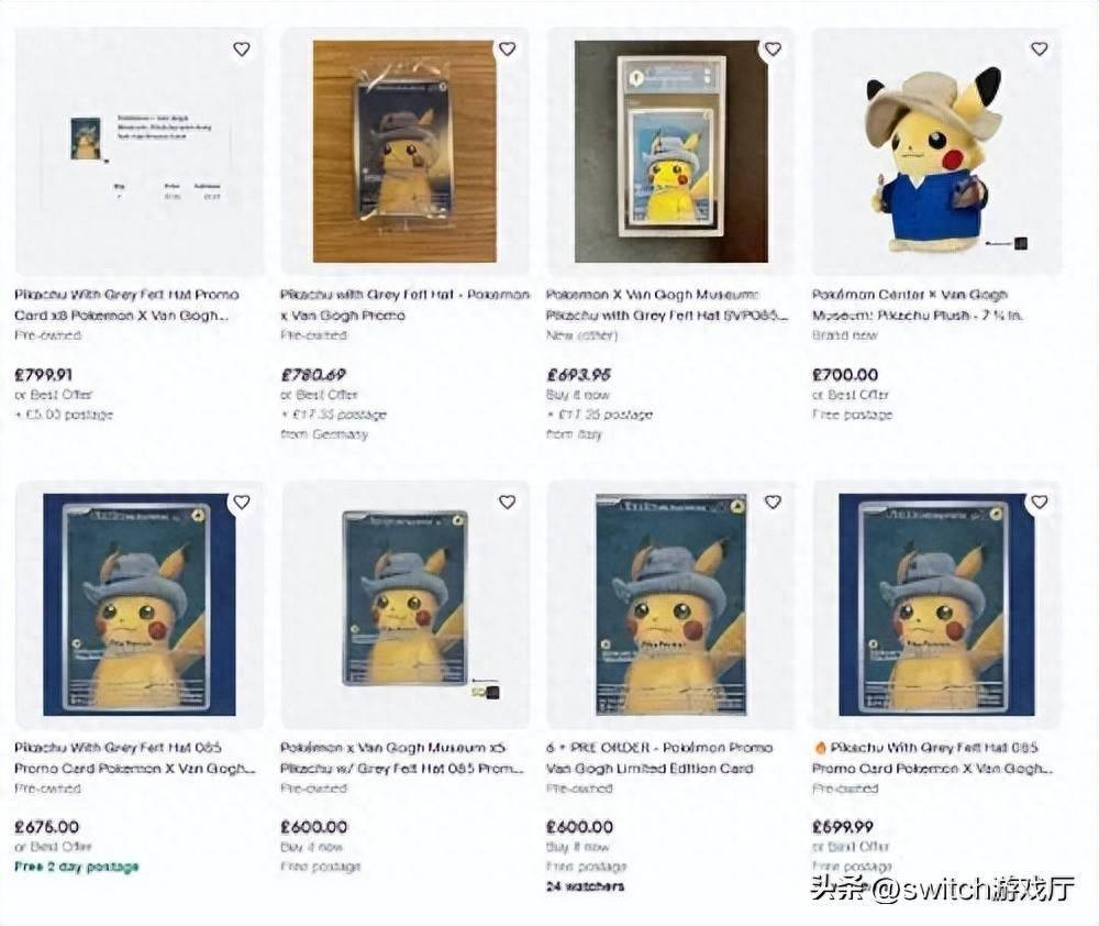 目前,eBay上已有超过2500件关于宝可梦×梵高联动系列商品。作为赠品可免费获得的“戴灰色毡帽的皮卡丘”的特别促销卡以超过500美元(合人民币3650元)的价格进行出售。一位卖家甚至对这张卡片进行了专业鉴定,要价800欧元(合人民币6173元)。