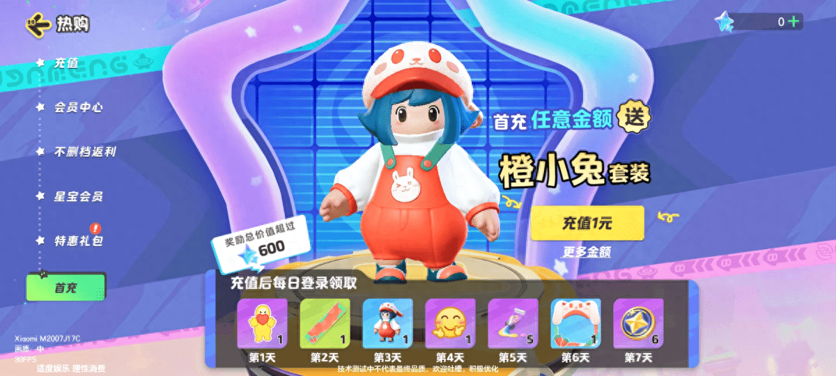 除去福利之外,游戏里还是有一些氪金点的存在,不过从整体上看花费并没有同类型的其他游戏夸张,甚至可以说是非常良心,就比如游戏首充就只要1块钱,而且首充送的皮肤还是蓝色品质的橙小兔,这也比其他游戏给的绿色品质要好,同样是花一块钱,在《元梦之星》里却更值,甚至氪金的第一个十连也就只要五折的价格。