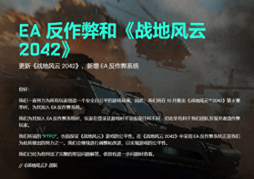 根据 EA 官博的最新消息:“我们一直努力为所有玩家创造一个安全且公平的游戏环境。因此,我们将在 10 月推出《战地 2042》第6赛季时,为其加入 EA AntiCheat 反作弊系统。”