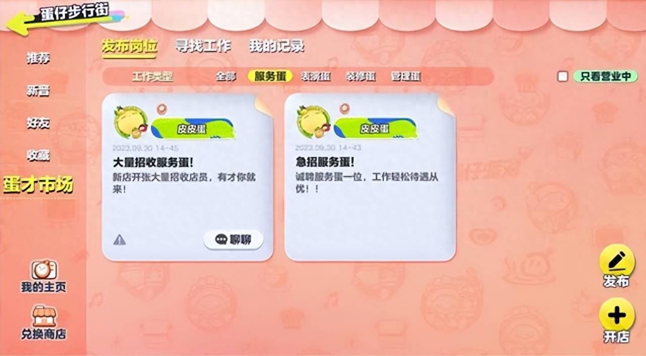 这时店铺已经初具规模,但身位老板的小编怎么能只身工作呢?招聘员工干活成为眼下的重中之重。经营中最为重要的便是服务与装修,小编发布招聘要求后不一会就有两三个陌生蛋私聊想要入职。经过几个问题的筛选,最终敲定了一名服务蛋和一名装修蛋。