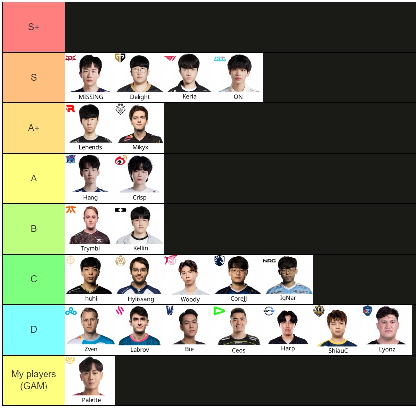 辅助位置的S+空缺出来了,JDG辅助Missing、GEN辅助Delight、T1辅助Keria和BLG辅助ON都是S级并列最高。