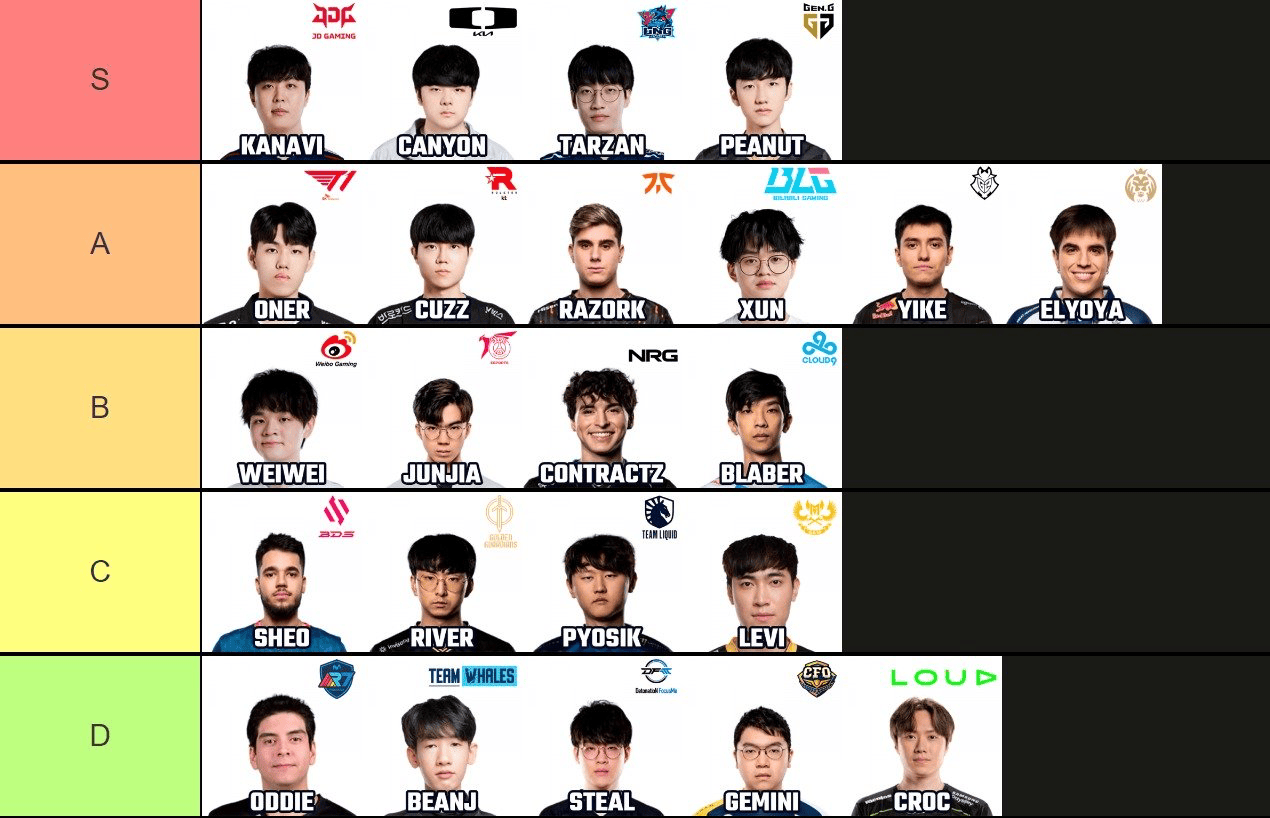 打野位置Kanavi、Canyon、Tarzan、Peanut这四位韩国打野都是S级,国产打野排行最高的是A级的Xun,WBG打野Weiwei仅排在B级