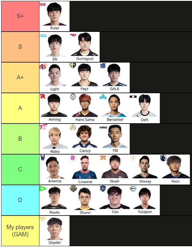 下路位置的排行上,Ruler是唯一S+,堪称AD位置的真神。Elk、Gumayusi都是S级紧随其后。Light、Peyz、GALA都是A+级差距也不大。S12冠军下路Deft只有A级。