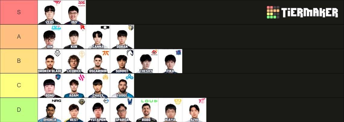 上单Zeus、369是S级,Bin和其他三位LCK上单并列A级,然后LPL两位上单TheShy和Zika只有B级。
