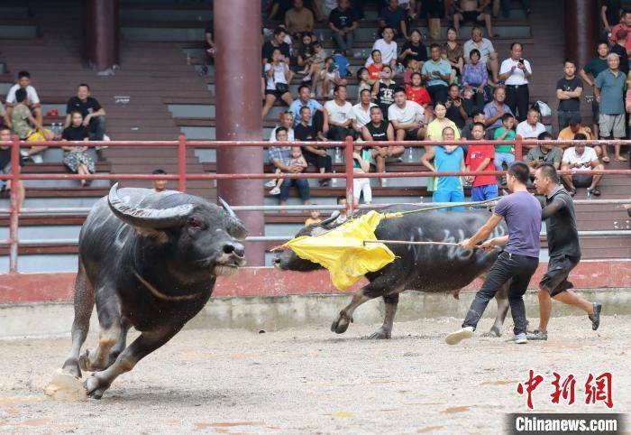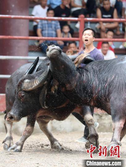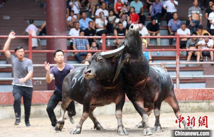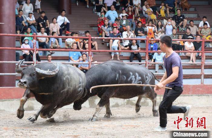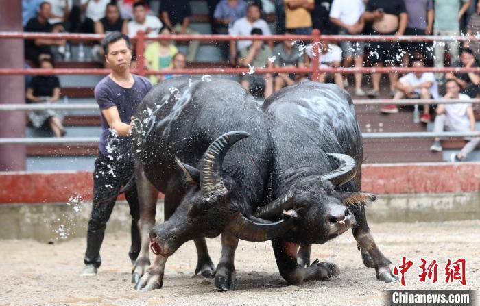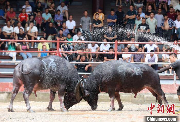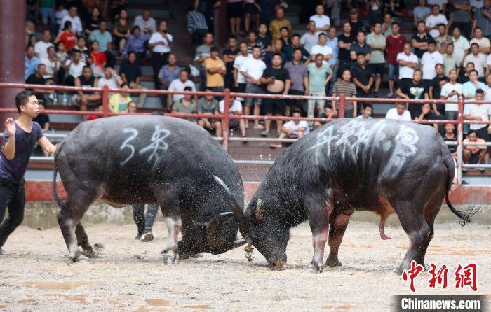 10月1日,广西三江侗族自治县月也侗寨景区举行超级牛王争霸赛,来自广西、贵州等地的8头牛王同台竞技、激烈对决,生动演绎侗乡斗牛文化魅力,为游客带来一场场精彩绝伦的视觉盛宴。