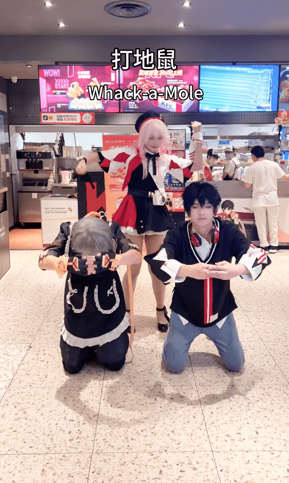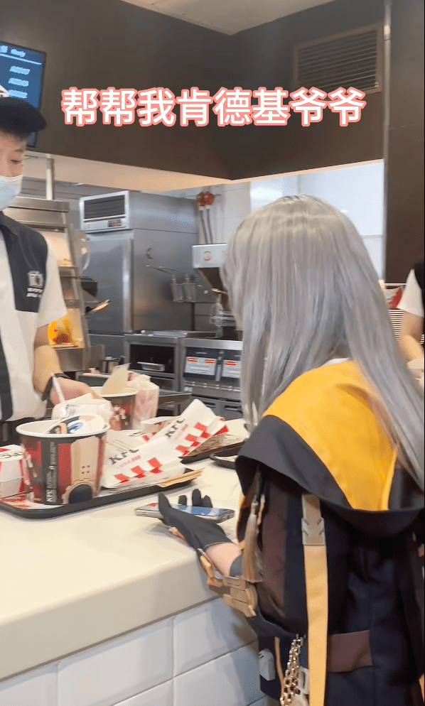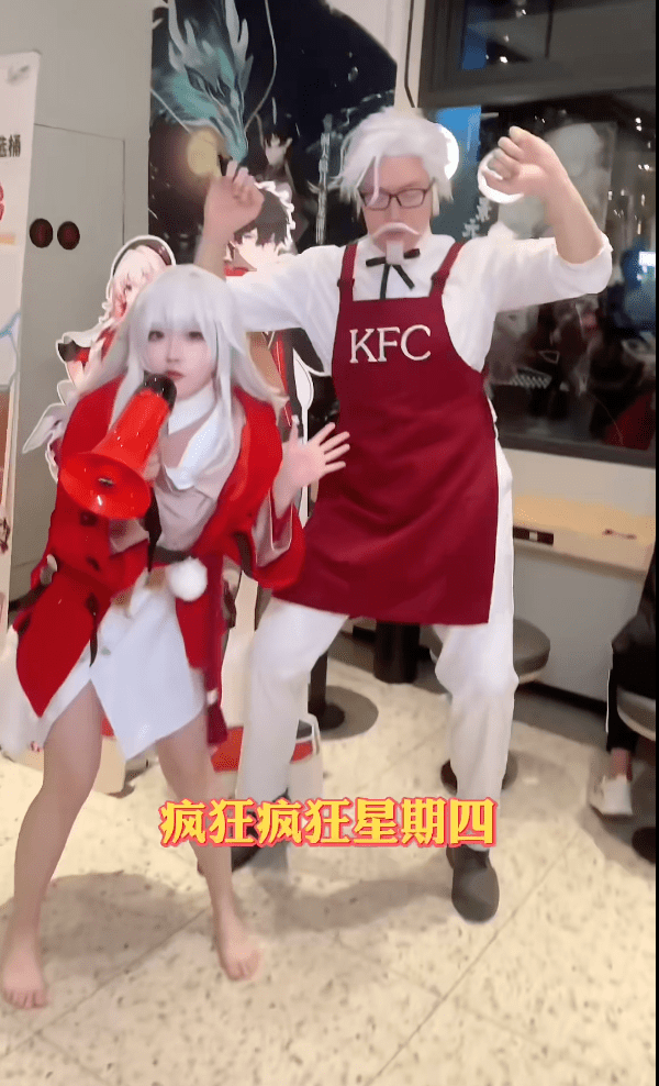 门店里各种整活也是十分欢乐。比如COS成三人组在KFC门店进行“炸裂”表演,让人忍不住发出灵魂拷问:现实世界没有您在意的人了吗?