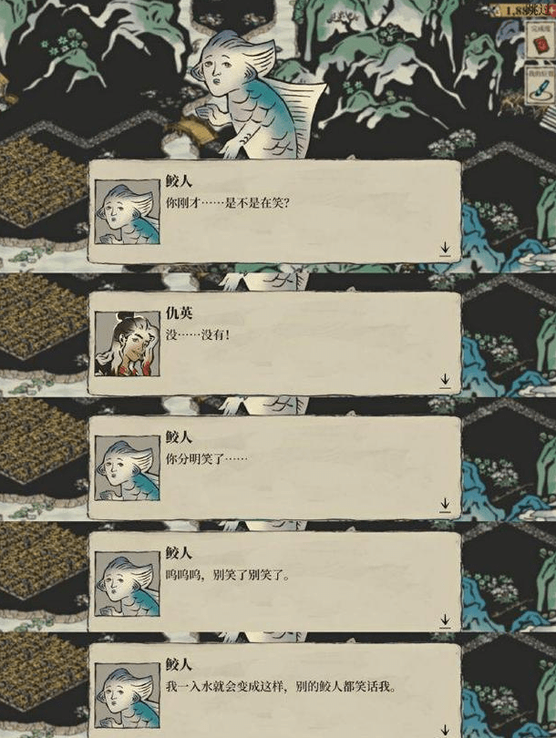 类似还有《江南百景图》中的鲛人,人不人鱼不鱼的形象,那张脸总给人一种委屈巴巴的感觉,看着就想笑。估计画师自己也创作之后也被逗乐了,所以还特意为其加了一段嘲讽值拉满的文案。