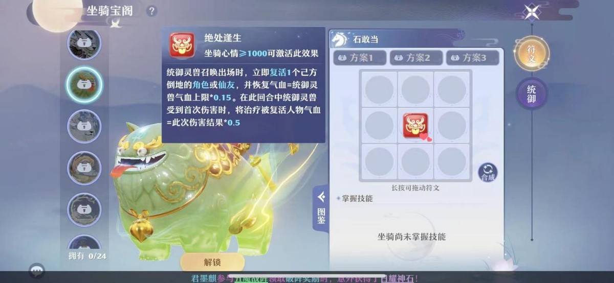 其实如果各位了解过石敢当的过去,可能就会对这个“丑东西”肃然起敬了,它其实是象征着祥瑞的狻猊,默默无闻地守护了人类一百年,最后诚心感动了仙盟,被赐名石敢当,模样也变得好看了点(现在这样)。毕竟是瑞兽,别看其貌不怎么扬,但本事可不小,它的心情技能“绝处逢生”能够复活己方的角色或仙友,这要是善加使用的话,绝对是可以扭转战局的存在。