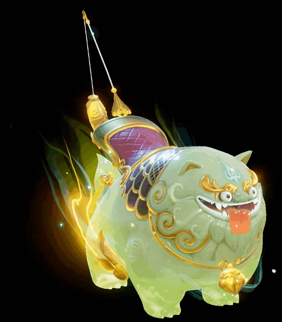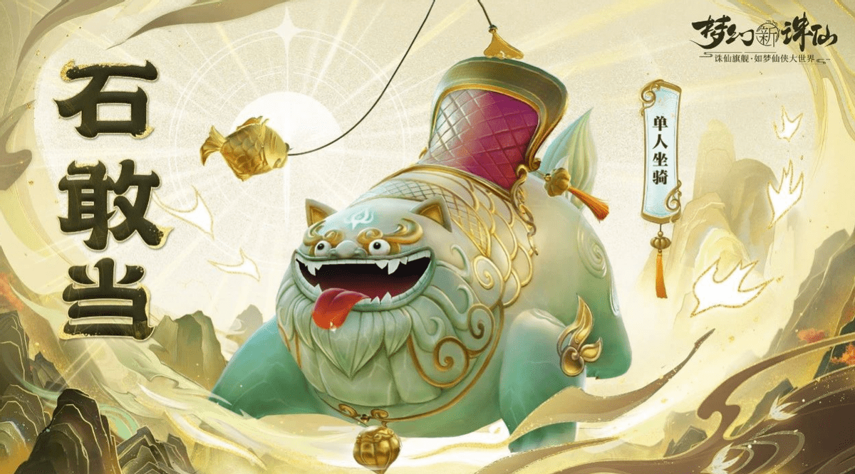 怎么样,是不是被丑到了?这“丑东西”便是《梦幻新诛仙》手游中推出的新坐骑石敢当。水头超足的翡翠皮肤,脖子挂着金项圈,尾巴挂着金鱼,这又是金又是玉的,按理来说也该是贵气逼人,结果全被那圆润的没有一点棱角的脑袋和充满智慧的眼神给毁了,而且这又吐舌头又摇尾巴,像极了不太聪明的二哈。第一眼看上去的感觉就是丑,但又忍不住想要再看一眼,越看越丑,越丑越想看,这或许就是属于“丑东西”的独特魅力吧。
