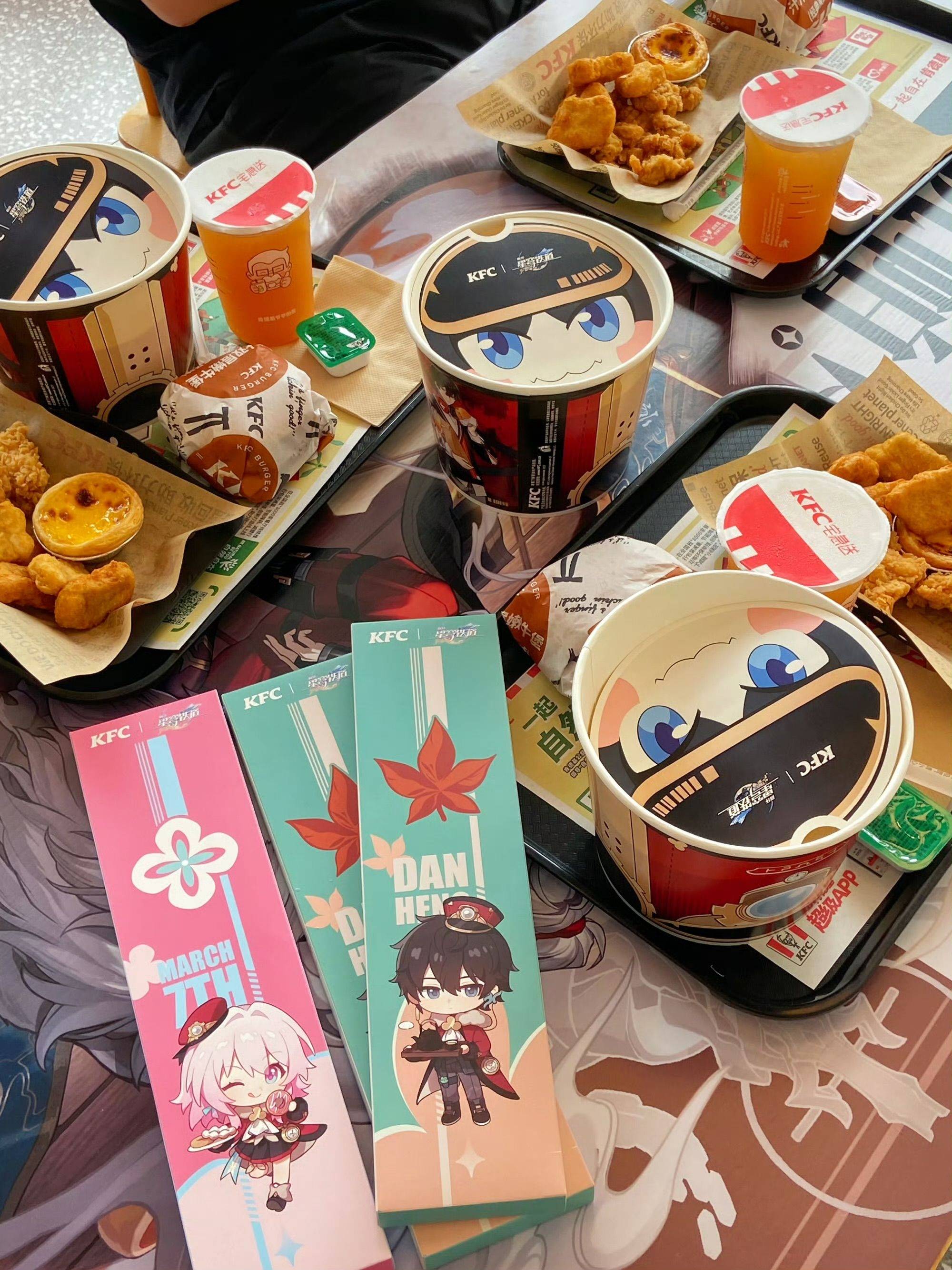 这次联动活动,KFC推出了两款联动套餐,一款55元套餐中附赠三月七和丹恒的联动镭射车票、镭射杯垫以及游戏内的头像、壁纸等虚拟道具。另一款60元套餐中附赠三月七和丹恒的Q版吸管以及游戏内的道具。这两款套餐都有帕姆的主题桶。