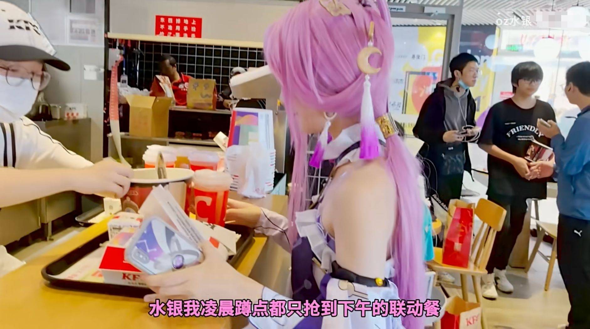 这样的情况不单单出现在一家门店里,其他的门店同样也有不少Coser去打卡,也有玩家自发进行的COS。社牛一点的还直接在门店进行表演,看起来不像是来KFC吃东西的,而是来参加漫展的。