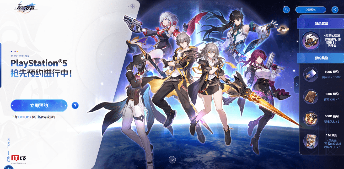 IT之家从官网注意到,《崩坏:星穹铁道》PS5 版本的预约数量已经突破 100 万,预约奖励包括信用点 ×1 万、冒险记录 ×5、凝缩以太 ×5、4 星光锥“早餐的仪式感(智识)”×1。