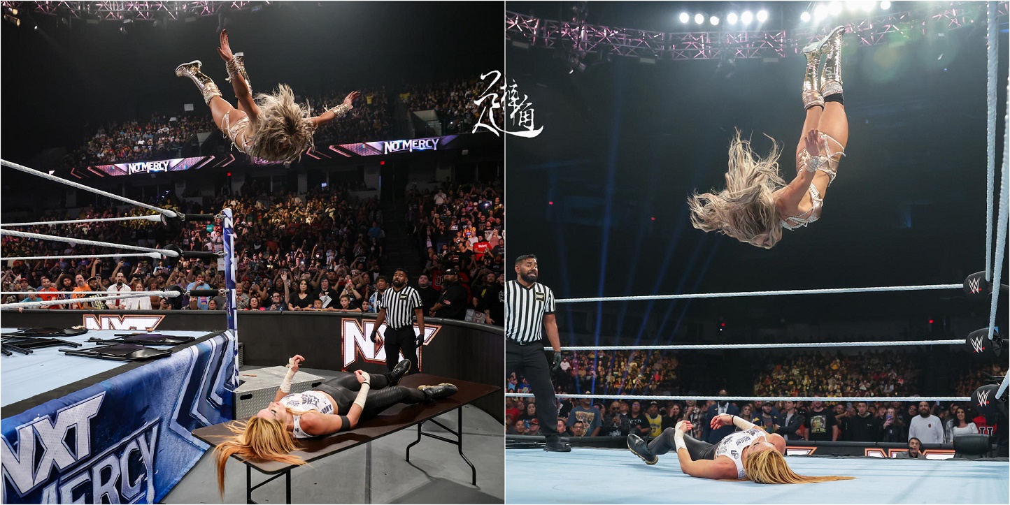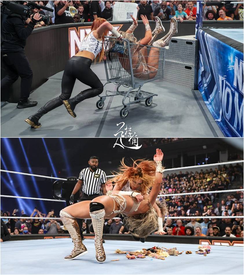 不得不承认,期间蒂芙尼在台上台下祭出的两个“前空翻圆月”完成度颇高,十分养眼,然而本应成为她决定性一击的“后空翻月面”,却在两次使用过程中都被贝基林奇反制成了Manhandle Slam,台上那次还自带铁椅“铺垫”