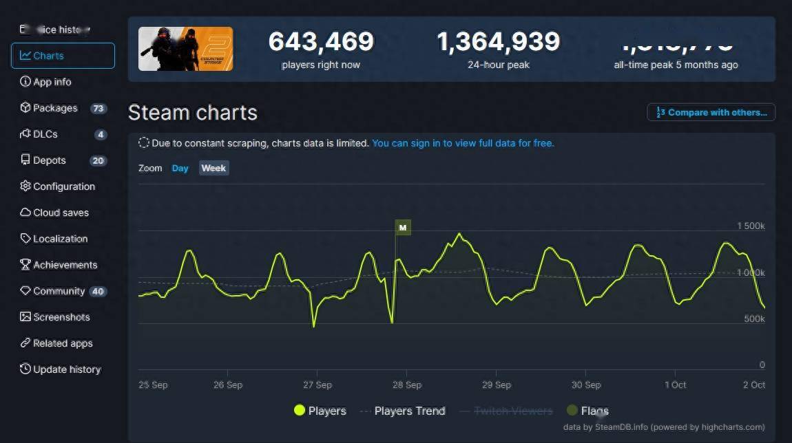CS2的在线峰值比首发当天多了一点:136万