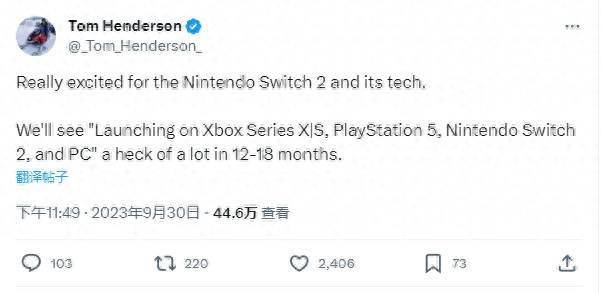 知名舅舅Tom Henderson在推文中表示他本人对Switch 2及其技术非常兴奋,未来12-18个月,玩家将会看到大量多平台游戏宣布时也会同步登陆Switch 2。