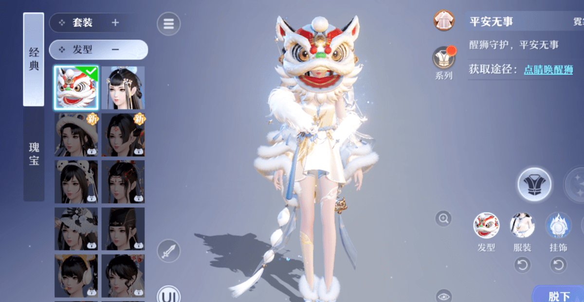 除了衣服,还有醒狮帽子发型,仔细看都能看到上面的毛发随风摆动,细节满满;新的挂饰“震四方”创意十足,一双水汪汪的大眼睛,生怕谁抢走了它怀里的灯笼球一样;除此之外,还有一个发型“平安无事”,就是黎家师的同款狮子头,红白金配色更显喜庆。