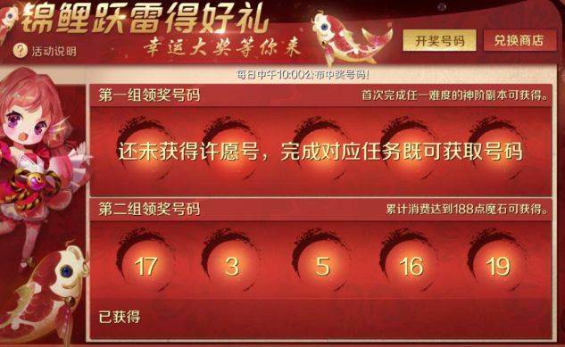 游戏中达成任务,还可以获得锦鲤幸运数,如果幸运数与中奖号码相同,就会获得幸运奖。