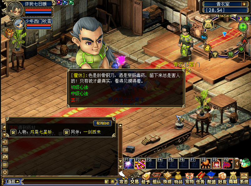 在游戏中,我不仅仅是一个独自行走的剑客,我还加入了一个名为青衣楼的门派。门派里都是疾风狼玩家,在门派中可以学习更高深的技能,得到更高的自身属性,共同追求着武林至高的荣耀。我在这个门派完成各种门派任务、参与门派战,不仅锻炼了自己的实力,也获得了更多的荣誉。