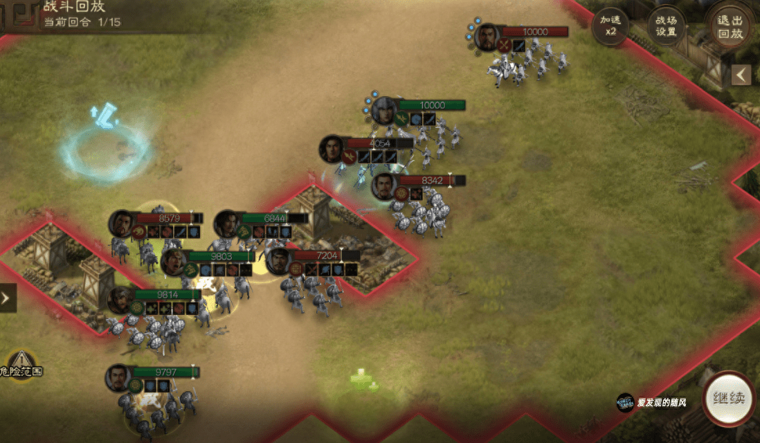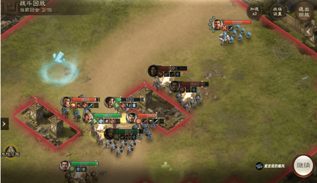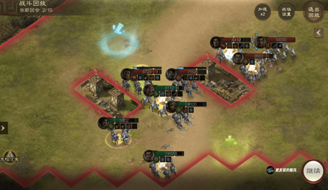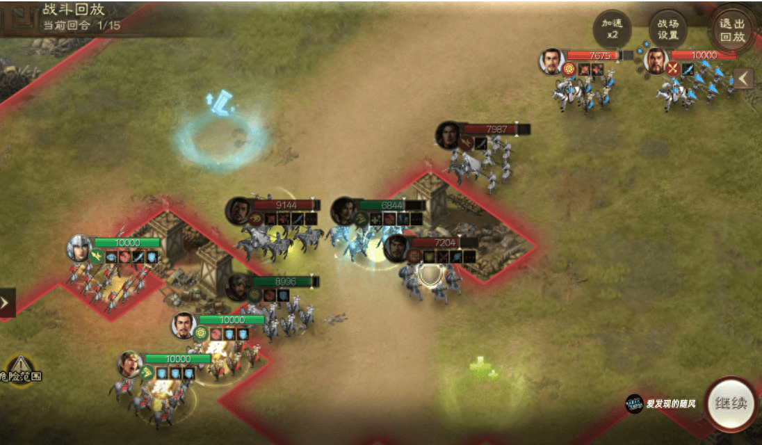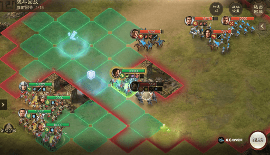 第二回合,蜀国先手,廖化往前顶治疗自己,但这个位置还是没办法给到赵云保护,不在廖化四格范围内。