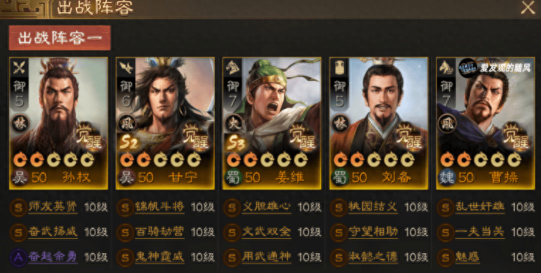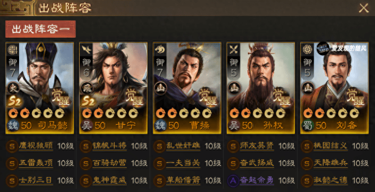 三皇队伍在有甘宁这种双动机制的武将下,对面队伍的进攻压力是非常大的,一旦让甘宁活到放出第二次自带,基本游戏就结束了。而三皇这边即使甘宁被击杀,也有孙权辅助加另一个C位高爆发,而且自身刘备+曹操的组合是比较难被突破的。
