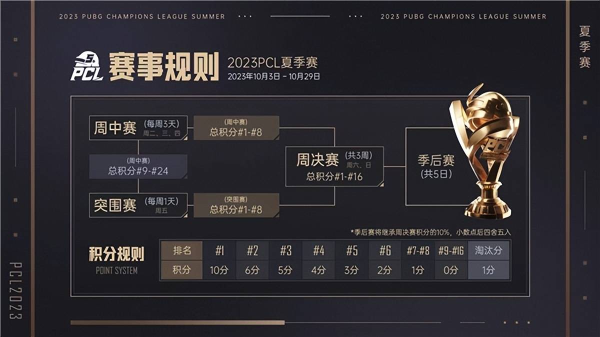 最终在10月25日至29日,通过五天季后赛决出最终的2023PCL夏季赛总冠军,同时还将揭晓2023PGC的参赛名额。冠军奖杯和世界赛门票最终将花落谁家,我们一起拭目以待!