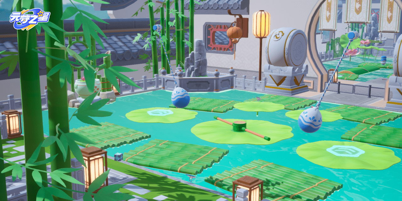 整体场景一眼看上去非常清凉惬意,竹叶,荷花,石墩等元素体现出中式庭院曲径通幽的特点,竹筏错落有致排布碧水之上,荷叶微动,茂林修竹投下斑驳阴影,一边进行着刺激的闯关游戏,一边体验着中国人独有的浪漫。