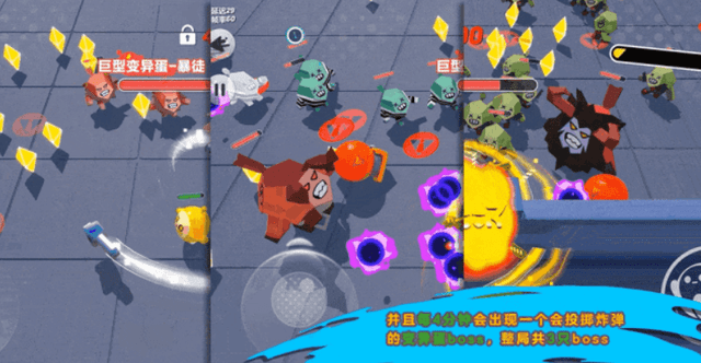 每局还有三只会投掷炸弹的巨型变异蛋,威胁加倍,此时只有走位最风骚、技能搭配最合理的玩家才能战胜它们!变异蛋狂潮不仅需要极强的手眼协调能力,还需要根据实际情况作出正确选择的智慧!如果你热衷挑战自己,变异蛋狂潮绝对是不容错过的玩法!