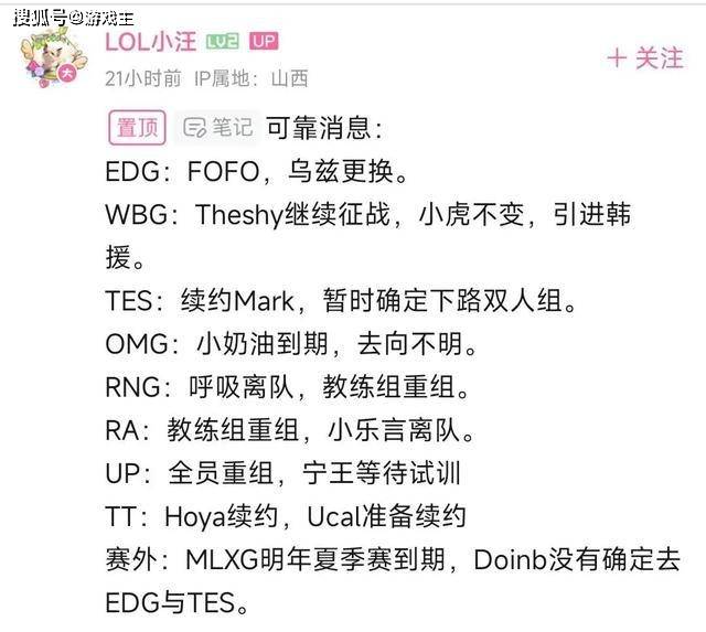 大家好,S13赛季的比赛已经正式开始了,相信绝大多数的玩家都关注了最近一段时间的对抗。各大赛区都进入到了一小段时间的休赛期,参与世界赛的队伍都在积极的备战。这两年里,lpl赛区的整体人气和热度提升的飞快,选手之间的变动也是非常的大,就在最近,有网友透露了一下转会期的小道消息,Rng战队在这一次的转会中出现了很大的人员调整,而w bg战队的上单选手Theshy是不会退役的,让粉丝们最意外的应该还是打野的麻辣香锅,已经离开rng战队这么多年了合同竟然还没有到期。