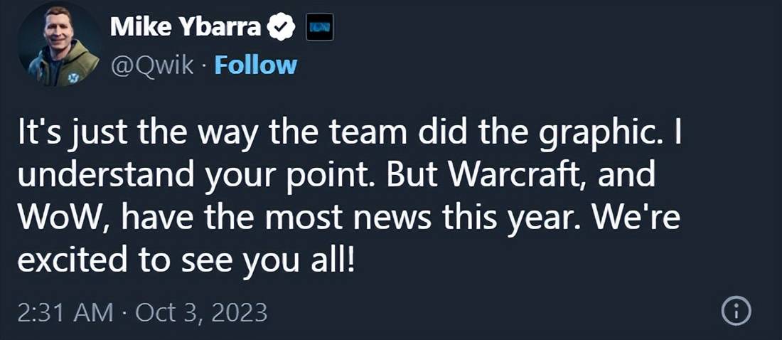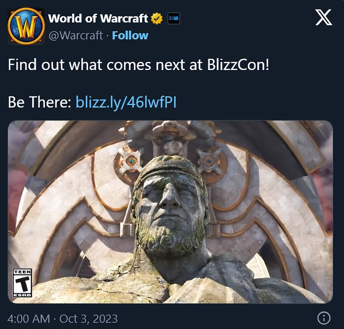 另外,暴雪官推在10月3日发布一段《魔兽世界》的宣传视频,由10.0的一些电影片段剪辑而成,配文“加入我们,一起开始下一次冒险”!对暴雪嘉年华作了预热。而暴雪娱乐总裁迈克·伊巴拉也在10月3日发推文称“魔兽争霸和魔兽世界将是今年新闻最多的项目。”