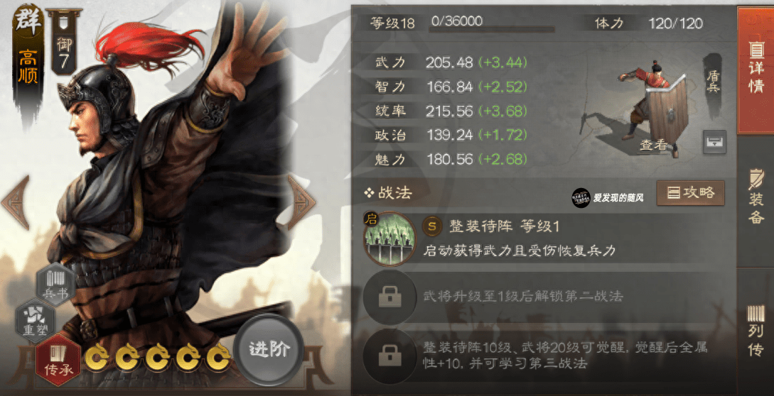 加强后的高顺既可以携带援护分摊战法,又可以携带攻击战法如百骑劫营+鬼神霆威、趁虚而入+乘间击瑕,甚至还可以利用高武力携带一个奋起余勇+奋武扬威或者老当益壮。