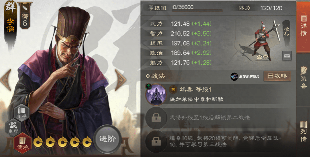 李儒,毒召的核心输出和断粮武将,自带战法的【断粮】和【中毒】效果居然是持续5回合的,太吓人了,这妥妥的核心强度。