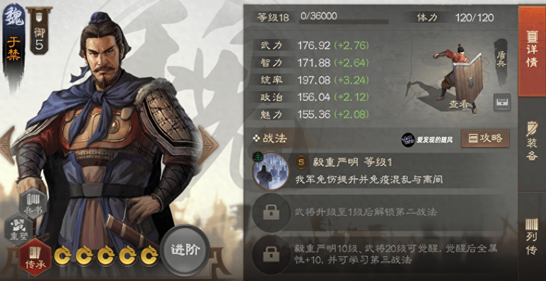 于禁,一个无论是开荒还是PVP都很好用的盾兵,5御的御值让他能配合荀彧腾出三个7御的位置给核心使用。