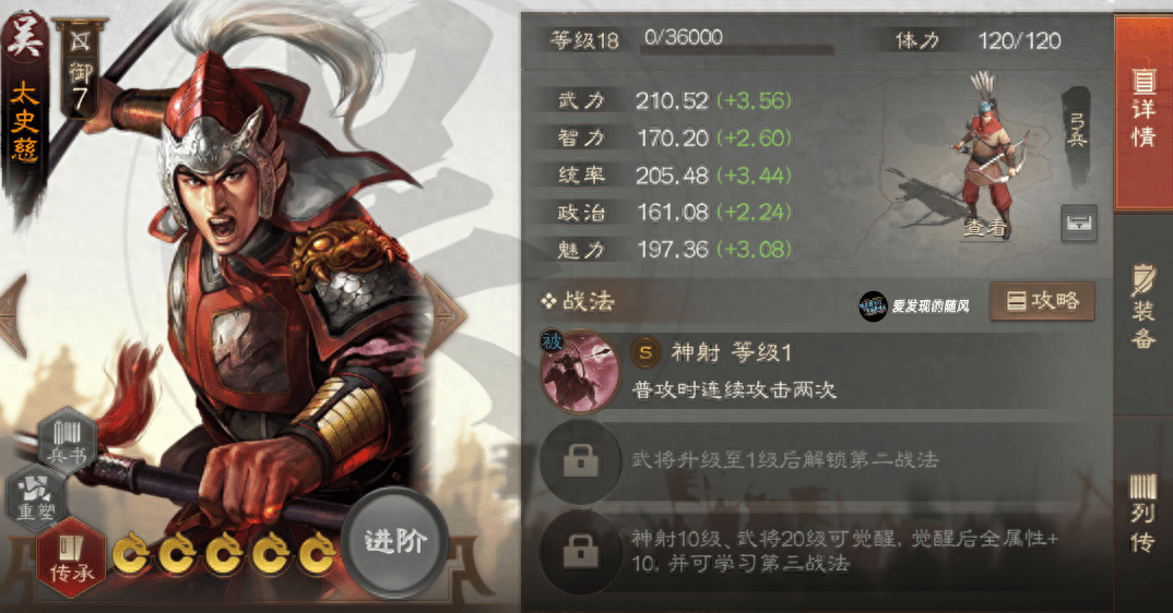 太史慈,天生自带连击的武将,携带两个突击战法,输出就十分爆表。孙权是太史慈的最好搭档,太史慈能给孙权叠被动,孙权能给太史慈提供武力和增伤,在孙权的辅助下太史慈甚至可以两刀一个盾兵,场均输出5W+,十分暴力。