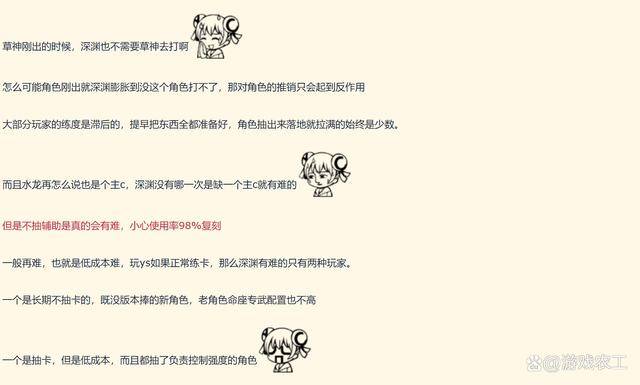 最后一个很玄学的问题,本期的卡池角色在深渊中有没有加成,或者是会不会克制深渊。从历史数据来看,农工觉得一般情况下,并不会出现太多变化或者是克制。几乎本期卡池的角色,在深渊中表现平平,当然一些版本之子无论有没有UP,在深渊都表现都十分优秀,所以并不会因为本期卡池角色策划就会特殊照顾,不过有时候确实会被撞到。