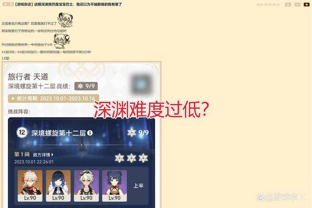原神这期的深渊玩家们的评价两极分化,有些玩家觉得原神4.1深渊膨胀过大,但是又有一些玩家觉得原神4.1深渊难度开始下降了,那么到底原神4.1深渊难度有没有变呢?于是农工为了找到这个问题的答案,直接在各大论坛中翻了几个帖子,大致懂了感觉难度小和难度大的玩家群体,因此也得出了原神深渊难度到底有没有膨胀这个问题的答案。