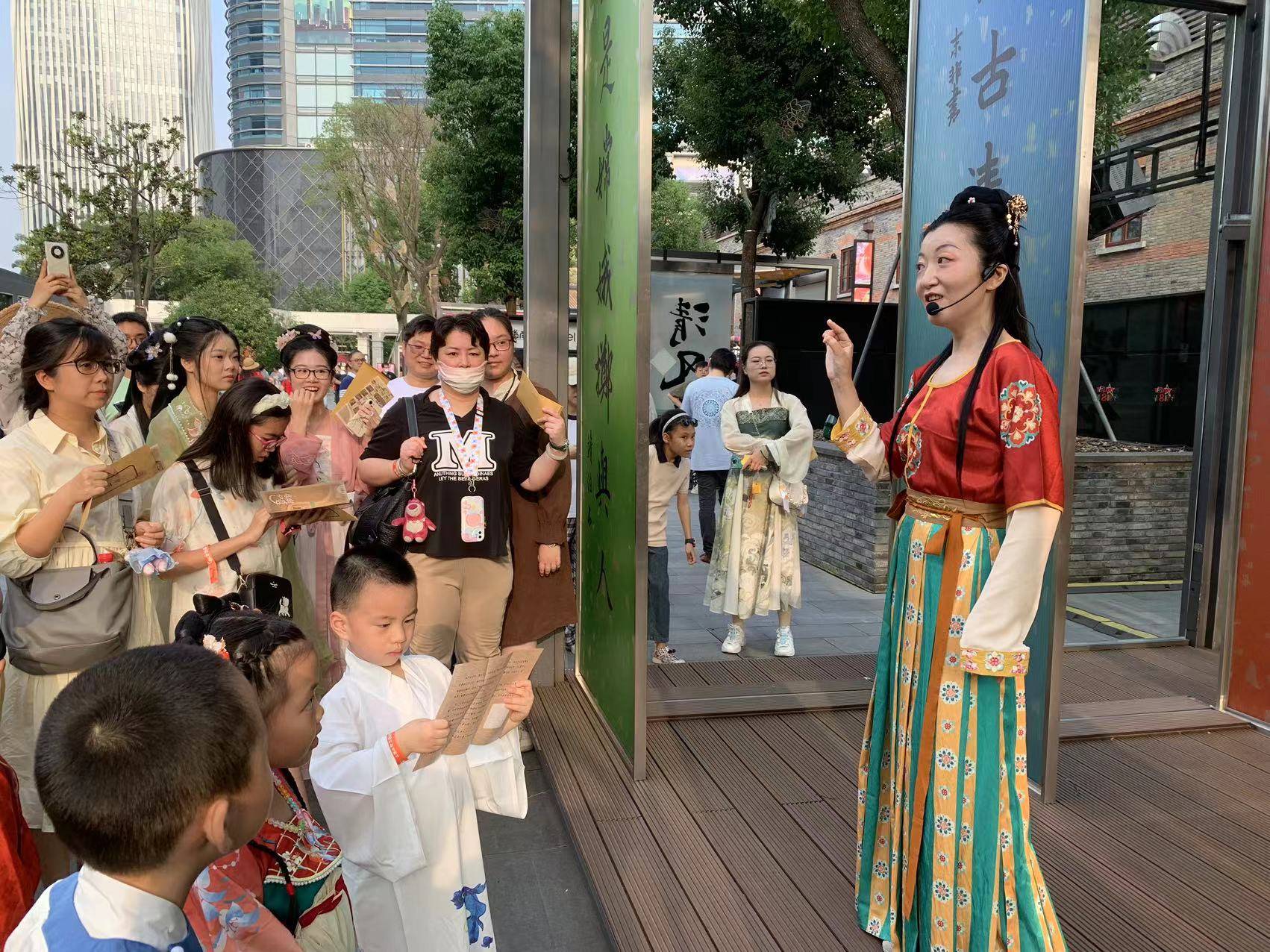 正读初一的媛媛跟着父母一起来完成挑战。起初,一家人始终找不到“张怀民”。媛媛忽而想起“苏轼”说,他与“张怀民”是“神仙友情”,而“苏轼”的最后一道考题是“‘但愿人长久’的后一句是什么?”她打开地图,循着名为“共婵娟”的灯箱装置而去,果然找到了“张怀民”。“这个游戏要时刻开动脑筋,把一些零散的线索关联起来找到答案。”媛媛说,走在弄堂中还要随时注意一些“突兀的东西”,比如门上的诗词、墙上的货品海报等,或许就是“通关密码”。