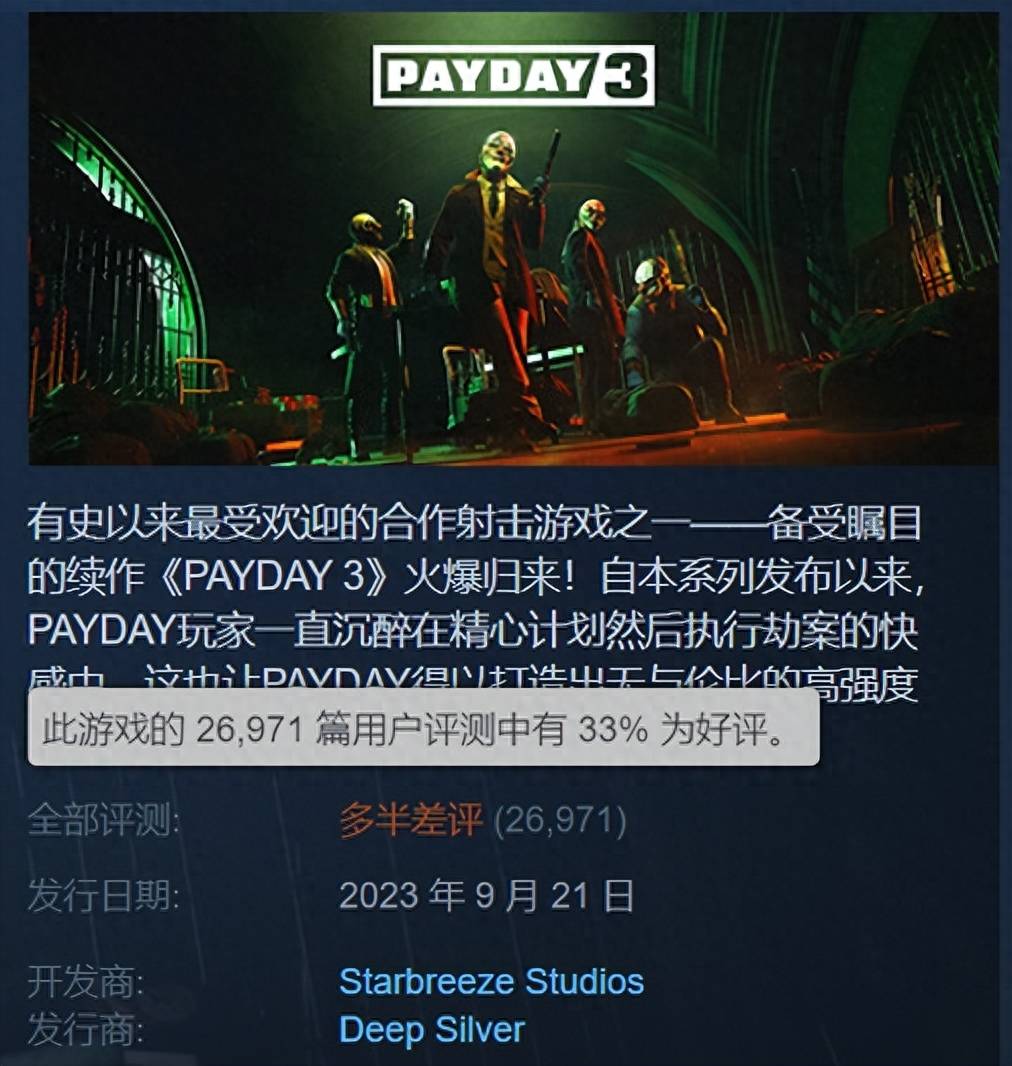 《收获日》是由Starbreeze Home开发,作为一款以抢金库为主要玩法的射击游戏系列,《收获日》系列鼓励潜入智取,而非正面硬刚。在前作的《收获日2》中,玩家一旦潜入不慎正面接敌就会被AI疯狂暴打,基本没啥胜算,因此《收获日2》也劝退了一大批萌新。